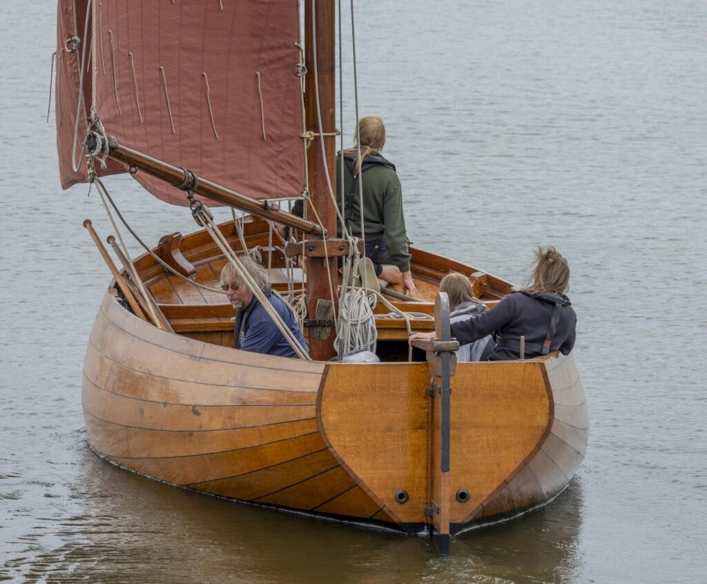 „Kenteren is het schip de wind uit de zeilen nemen en stil laten vallen. Dat deden ze vroeger om visnetten uit te zetten. Als je dan ook nog als die jol daarginds heel voorzichtig achteruit vaart, heb je daar mooi de gelegenheid voor. Maar dat is dus wel een vak apart.”
