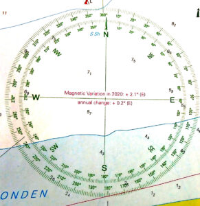 En de afgelopen decennia waren we in West Europa wel een beetje lui: De magnetische variatie was heel gering. In 2020 was dat + 2,1 graad oost. Iedere zeekaart geeft, vaak bij de kompasroos de variatie voor het gebied van de betreffende kaart.